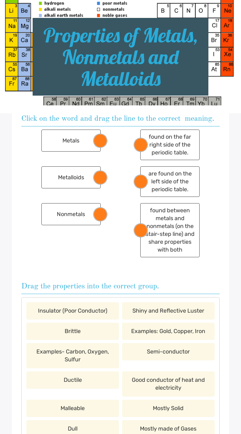 Metals found between metals and nonmetals and share properties with both metalloids found on the far right side of the periodic table. Metals metalloids and nonmetals lab, physical property of matter worksheet and metals nonmetals and metalloids worksheet are some main things we want to show you based on. Form anions ( only the eleven elements, h, c, n, o, p, s, se, f, cl, br, i and noble gases are nonmetals. Click on the word and drag the line to the correct meaning. The chemical elements can be broadly divided into metals, metalloids and nonmetals according to their shared physical and chemical properties. By the way, about metals and nonmetals worksheet, below we can see various related photos to give you more ideas. Metalloids typically have several forms or allotropes with very. The metals are to the left of the line (except for hydrogen, which is a nonmetal), the nonmetals are to the right of the line, and the elements immediately adjacent to the line are the metalloids. This worksheet can be downloaded in seconds along with the other valuable. These metals have properties that you normally associate with the metals you encounter in everyday life: In this worksheet, we will practice describing, comparing, and explaining the physical and chemical properties of metals, nonmetals, and metalloids. Metals, nonmetals, and metalloids do first activity the periodic table valence electrons 1. They are electronegative in character.